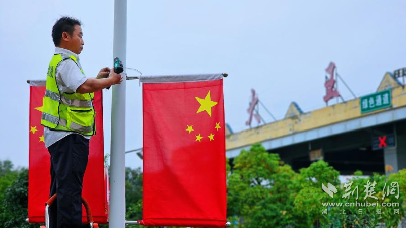 图为工作人员为欢度国庆悬挂国旗